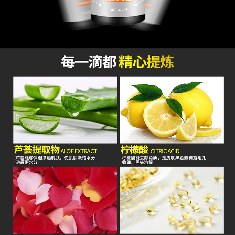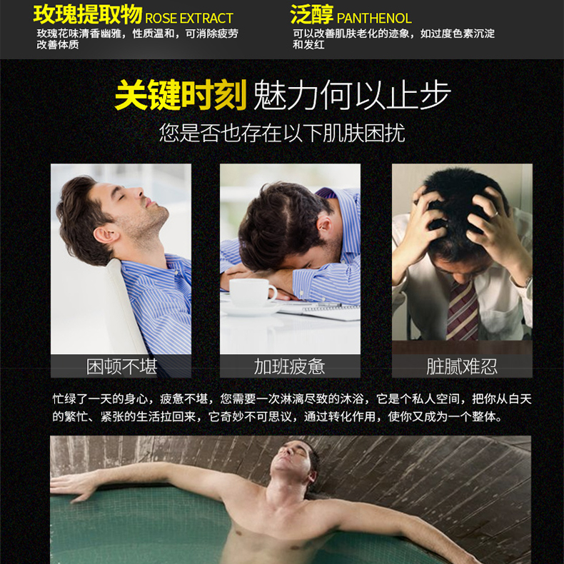 男士清爽沐浴露其主要成分有芦荟提取物、柠檬酸、玫瑰提取物、泛醇。每一滴都是