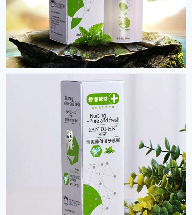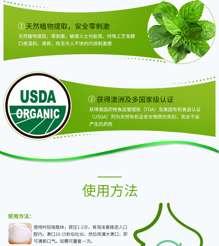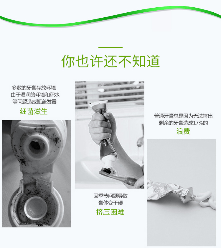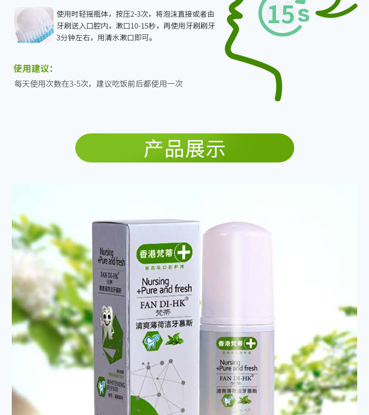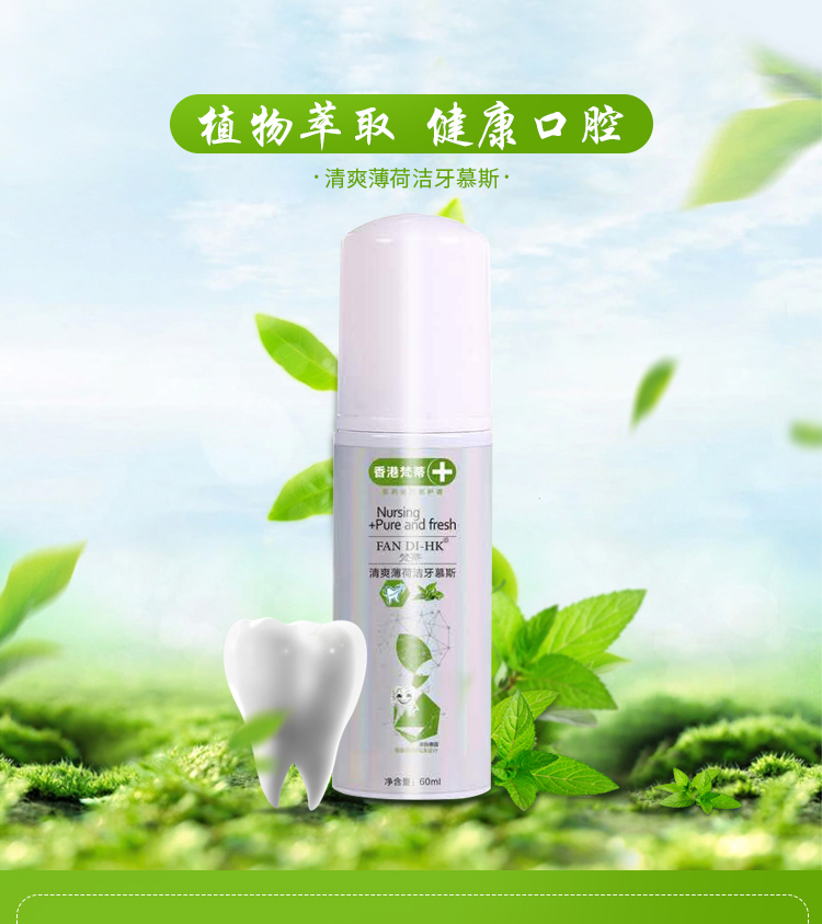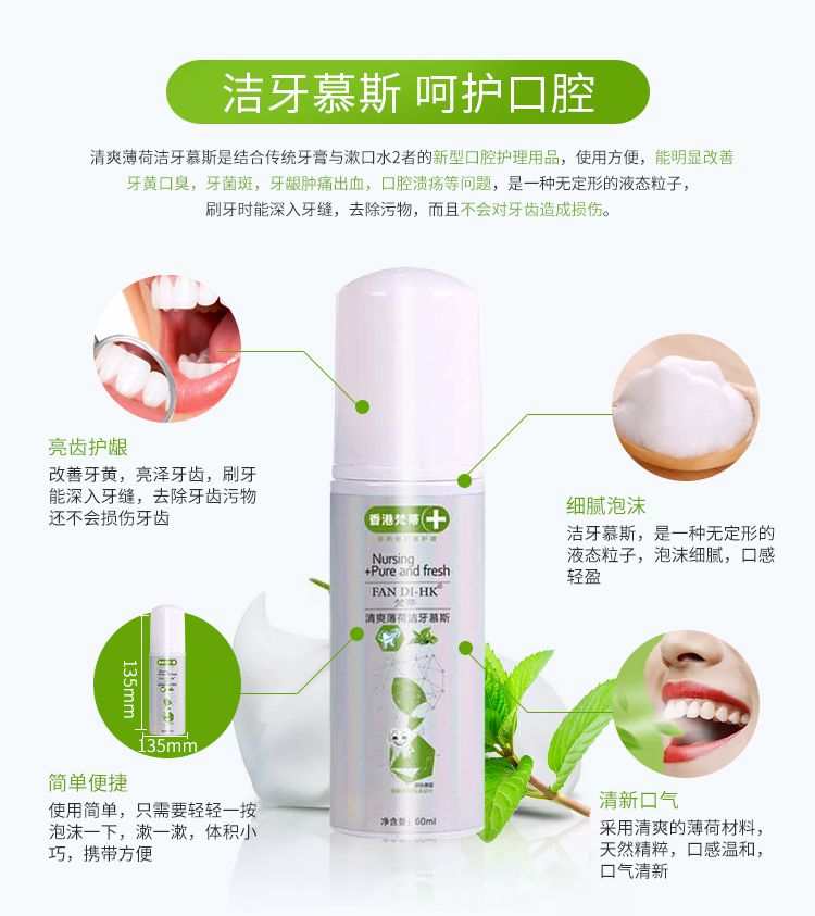 一个产品五种用途漱口水、齿膜、牙膏,牙粉,口香糖。按压即出慕斯质地,有效深入牙齿缝隙,杀菌除味修复保护全效合一。使用方便,易于携带。传统牙膏需要借助牙刷进行口腔平面清洁,并不能全面全效灭菌。同时,牙刷与牙齿长期摩擦会对牙齿或牙龈造成损伤。泡沫牙膏,一次性解决口腔多种问题。360度无死角直接有效杀灭口腔致病菌,长效维护口腔菌群平衡。轻盈温和的慕丝质地泡沫小分子渗透牙齿隙缝,更加深层清洁牙垢,不损伤牙齿及牙龈