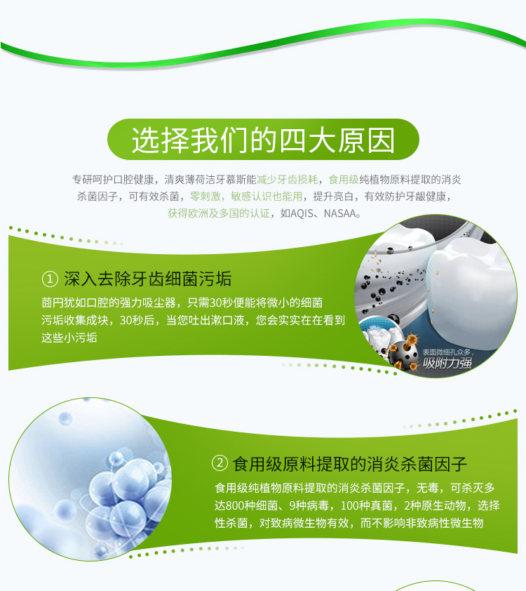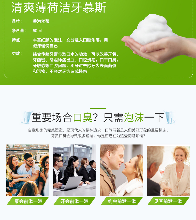 一个产品五种用途漱口水、齿膜、牙膏,牙粉,口香糖。按压即出慕斯质地,有效深入牙齿缝隙,杀菌除味修复保护全效合一。使用方便,易于携带。传统牙膏需要借助牙刷进行口腔平面清洁,并不能全面全效灭菌。同时,牙刷与牙齿长期摩擦会对牙齿或牙龈造成损伤。泡沫牙膏,一次性解决口腔多种问题。360度无死角直接有效杀灭口腔致病菌,长效维护口腔菌群平衡。轻盈温和的慕丝质地泡沫小分子渗透牙齿隙缝,更加深层清洁牙垢,不损伤牙齿及牙龈。