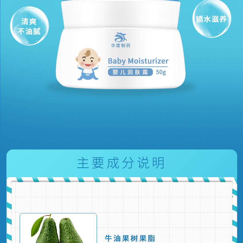 华厦婴儿润肤霜是一种乳化型膏霜,富含尿素成分和甘油,另添加牛油果树果脂和维生素E,能吸收空气中数倍于自身的水份,形成肌肤保护膜有效防止水份散失,长效保湿油包水配方,细腻润泽,亲和肌肤,更易被吸收,时刻保持肌肤滋润亮泽。适用于各类肤质,特别对干性肌肤和易干燥部位,效果更佳。