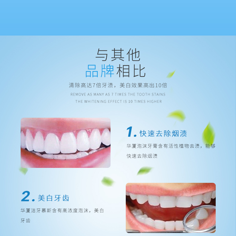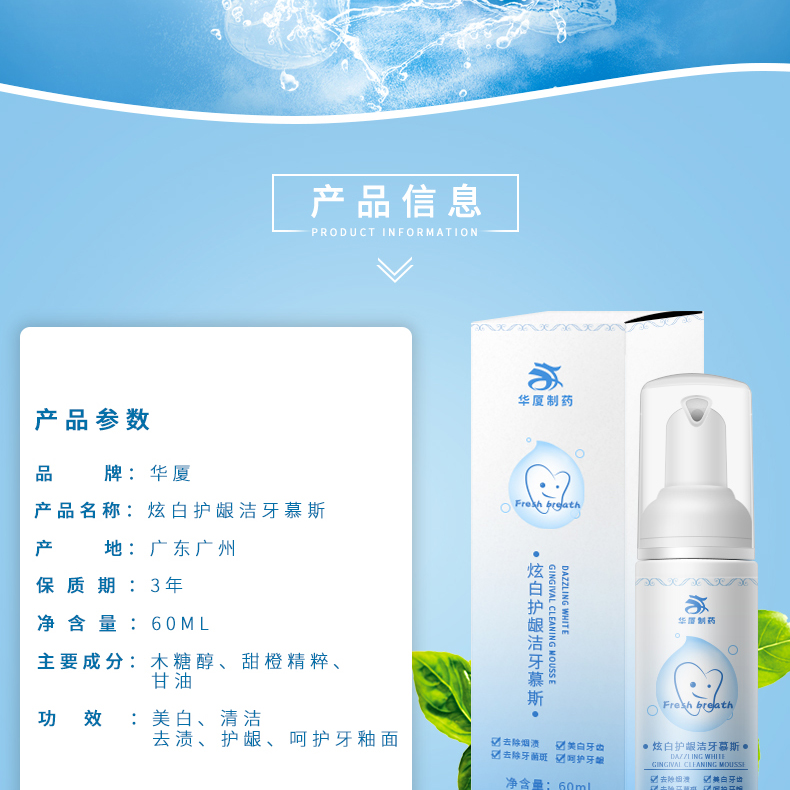 广州华厦生物制药有限公司的华厦炫白护龈洁牙慕斯料体为透明液体,是一种结合了传统牙膏和漱口水二者功效特点的新型口腔护理用品,具有溶解快、使用方便、渗透全面、功效明显等特点,且华厦炫白护龈洁牙慕斯在清洁护理口腔的时候不会损伤牙釉质,可以很明显的改善牙黄、牙菌斑、牙龈肿痛出血、口腔溃疡、口干口臭、牙敏感等多种口腔问题,华厦炫白护龈洁牙慕斯的优点很多,是一种无定形的液态粒子,刷牙时,能够深入牙缝,迅速去除附着在牙齿表面的菌斑和污物,且不会对牙齿造成损伤,具有令牙齿洁亮美白和细意呵护牙釉质的双重功效。