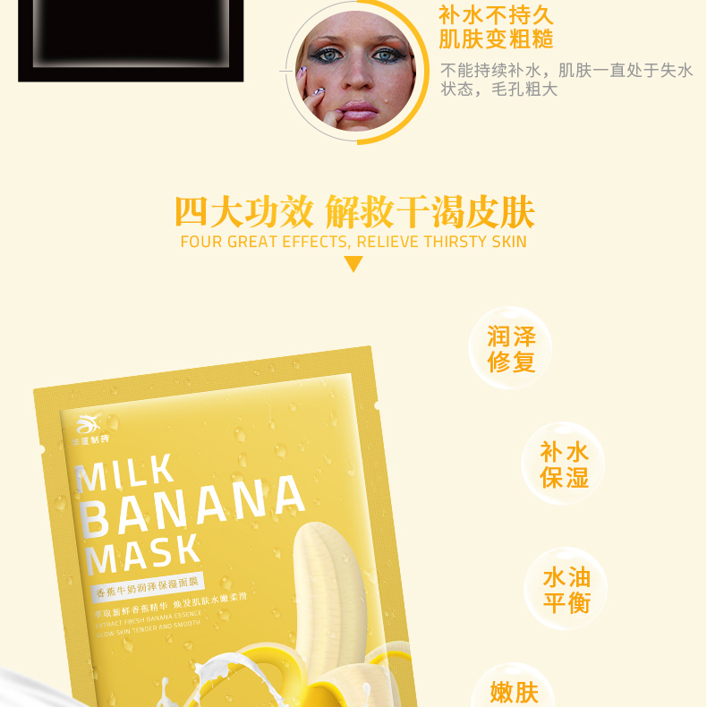 广州华厦生物制药有限公司的香蕉牛奶润泽保湿面膜是一种水果面膜。香蕉既是一种美味的水果,更是能改善肌肤毛病的好帮手,全因香蕉由内至外都有非常丰富的营养,香蕉的果肉具有降低胆固醇的作用,最神奇是蕉皮素还可抑制真菌和细菌,治疗皮肤瘙痒症,常吃香蕉更可预防脑中风和便秘,及有助减轻病情。除此之外,香蕉亦是理想的天然营养面膜,对面部皮肤皮下微细血管有调节平衡的作用。一天1根香蕉,让你美丽又窈窕,香蕉的油分与维生素成分敷后能渗入皮肤,润泽宝贝我们的肌肤,尤其特别适合干性肌肤者使用,用完之后格外滋润。还可以有效收缩毛孔。建议一星期使用2—3次。