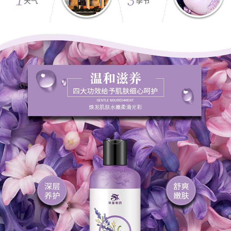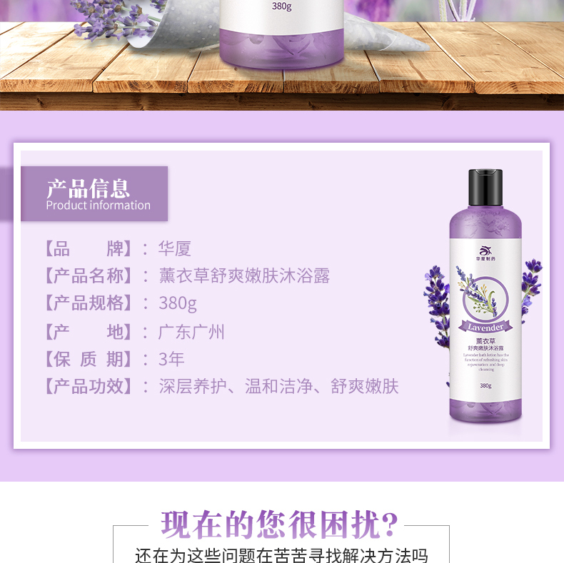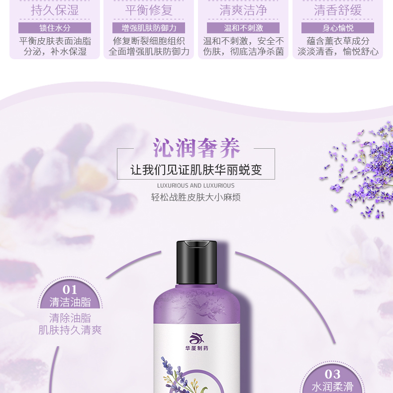 华厦薰衣草舒爽嫩肤沐浴露所使用原料全为天然食品级,无毒安全,能有效抑制有害细菌的滋长,增长你的免疫能力。享受花瓣沐浴的香薰,增加沐浴情趣,让你的肌肤更滋润光滑。