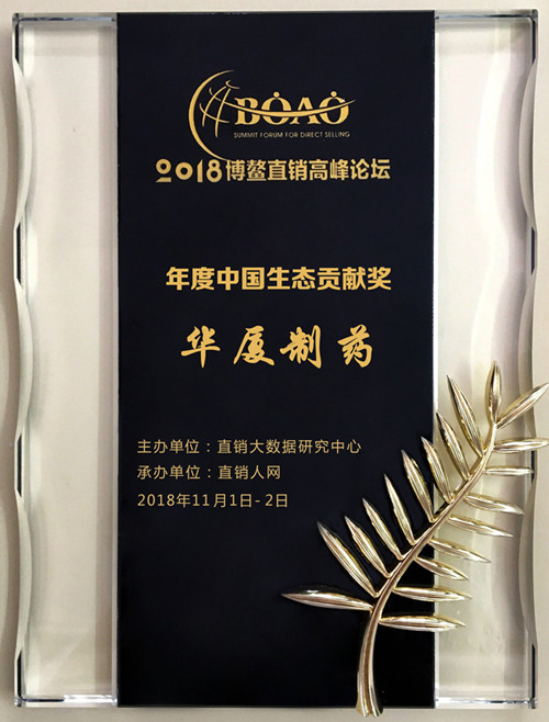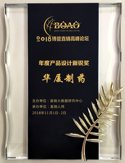 华厦制药凭借先进的生产技术和引领潮流的产品设计理念荣获2018博鳌直销高峰论坛“年度中国生态贡献奖”、“年度产品设计新锐奖”两项大奖!